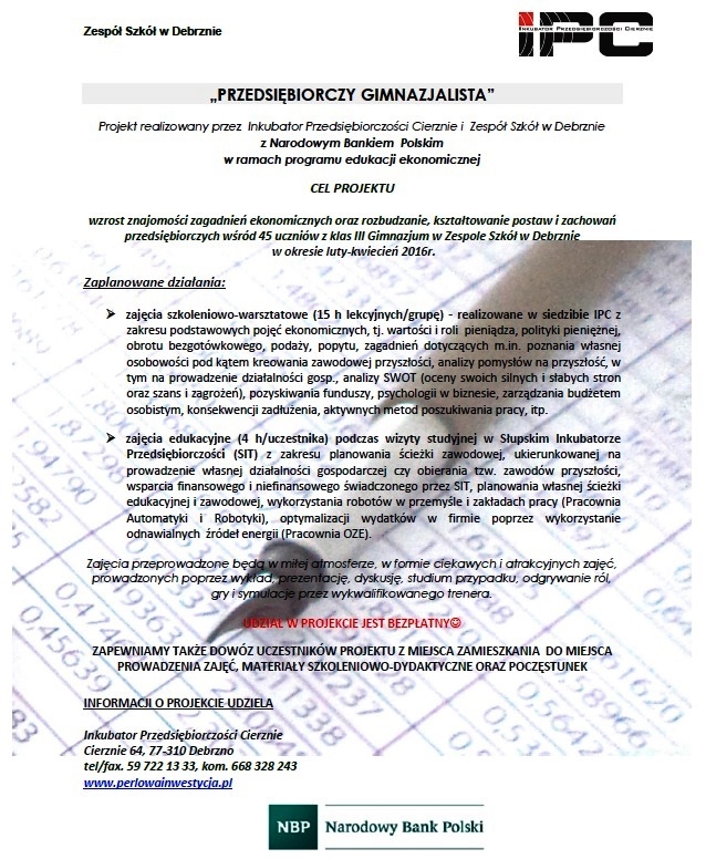 Zapraszamy Gimnazjalistów III kl. Zespołu Szkół w Debrznie do udziału w projekcie z zakresu edukacji ekonomicznej.