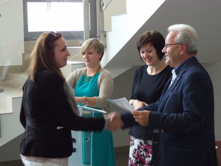 Przybyłych gości powitała Dyrektor Inkubatora Przedsiębiorczości Cierznie- Pani Nina Pachura oraz Burmistrz Miasta i Gminy Debrzno- Pan Mirosław Burak. Postępy w realizacji projektu przedstawiła Pani Iwona Kaczmarczyk- specjalista ds. koordynacji merytorycznej projektu. Poinformowała, iż w ramach rekrutacji do projektu zgłosiło się 79 osób. W kolejnym etapie rekrutacji, w wyniku oceny złożonych formularzy rekrutacyjnych i rozmowy indywidualnej, dokonanej przez Komisję Rekrutacyjną, do projektu zakwalifikowało się 25 osób. Uczestnicy Projektu ukończyli cykl szkoleniowo-doradczy, w ramach którego otrzymali wiedzę na temat zakładania i prowadzenia działalności gospodarczej. Mimo, iż planowano objąć wsparciem 20 osób, w wyniku powstałych oszczędności, ostatecznie 21 osób otrzymało jednorazową dotację inwestycyjną w wysokości do 40.000zł. Ponadto w ramach projektu Uczestnicy otrzymają podstawowe wsparcie pomostowe przez okres 6-ciu miesięcy w wysokości do 1.500zł miesięcznie. Pani Dyrektor wraz z Panem Burmistrzem wręczyli symboliczne czeki Uczestnikom Projektu, gratulując im sukcesów zawodowych w nowo rozpoczętych działalnościach gospodarczych. Nie zabrakło także podziękowań ze strony Uczestników projektu oraz okolicznościowego tortu dla przybyłych gości.
