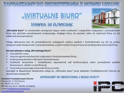 Zapraszamy do skorzystania z nowej usługi „WIRTUALNE BIURO”Pragniemy Państwa poinformować, iż Inkubator Przedsiębiorczości Cierznie wprowadza nową usługę pod nazwą „Wirtualne Biuro”.