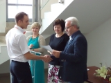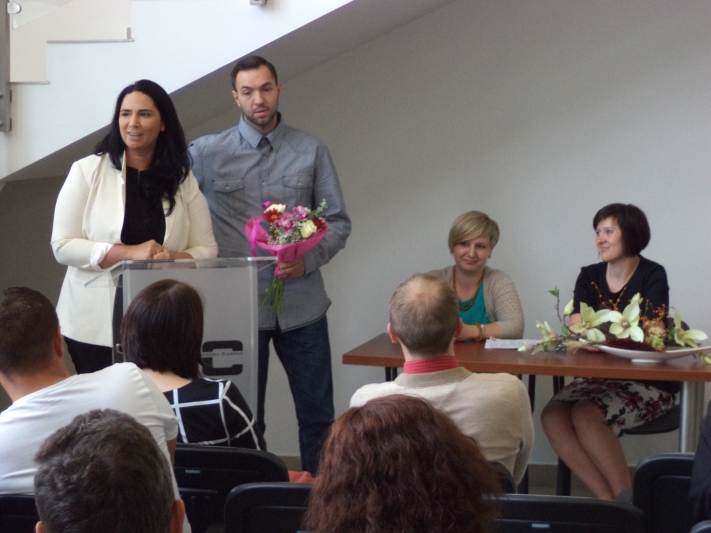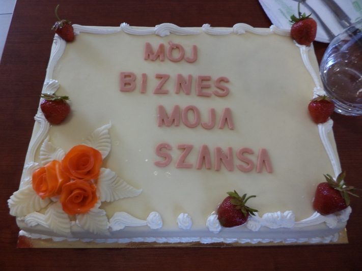 Przybyłych gości powitała Dyrektor Inkubatora Przedsiębiorczości Cierznie- Pani Nina Pachura oraz Burmistrz Miasta i Gminy Debrzno- Pan Mirosław Burak. Postępy w realizacji projektu przedstawiła Pani Iwona Kaczmarczyk- specjalista ds. koordynacji merytorycznej projektu. Poinformowała, iż w ramach rekrutacji do projektu zgłosiło się 79 osób. W kolejnym etapie rekrutacji, w wyniku oceny złożonych formularzy rekrutacyjnych i rozmowy indywidualnej, dokonanej przez Komisję Rekrutacyjną, do projektu zakwalifikowało się 25 osób. Uczestnicy Projektu ukończyli cykl szkoleniowo-doradczy, w ramach którego otrzymali wiedzę na temat zakładania i prowadzenia działalności gospodarczej. Mimo, iż planowano objąć wsparciem 20 osób, w wyniku powstałych oszczędności, ostatecznie 21 osób otrzymało jednorazową dotację inwestycyjną w wysokości do 40.000zł. Ponadto w ramach projektu Uczestnicy otrzymają podstawowe wsparcie pomostowe przez okres 6-ciu miesięcy w wysokości do 1.500zł miesięcznie. Pani Dyrektor wraz z Panem Burmistrzem wręczyli symboliczne czeki Uczestnikom Projektu, gratulując im sukcesów zawodowych w nowo rozpoczętych działalnościach gospodarczych. Nie zabrakło także podziękowań ze strony Uczestników projektu oraz okolicznościowego tortu dla przybyłych gości.